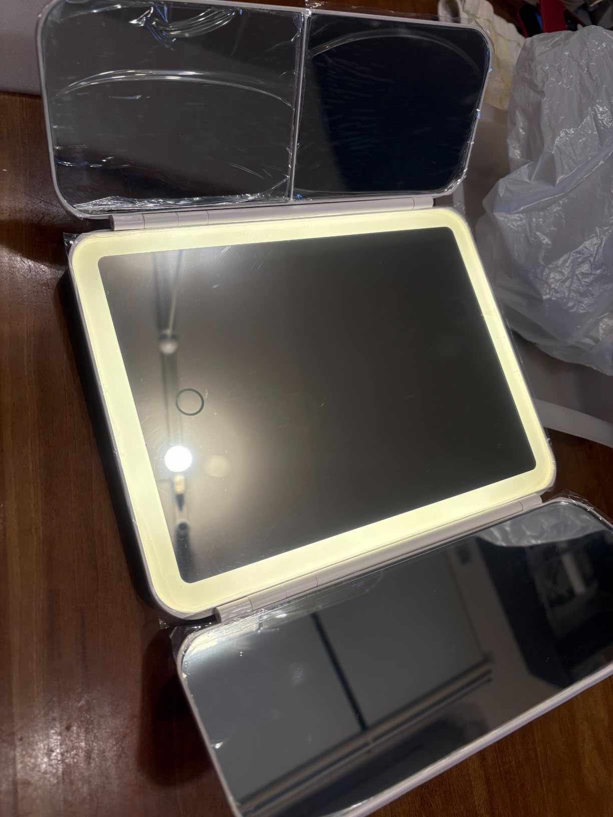 This small vanity mirror with lights features a sleek trifold design that blends seamlessly into any modern space. Whether it’s placed on a bathroom counter, bedroom vanity, or travel bag, its compact form makes it easy to store, move, and use anywhere. The foldable panels protect the mirror surface, while the detachable base allows for even more portability.