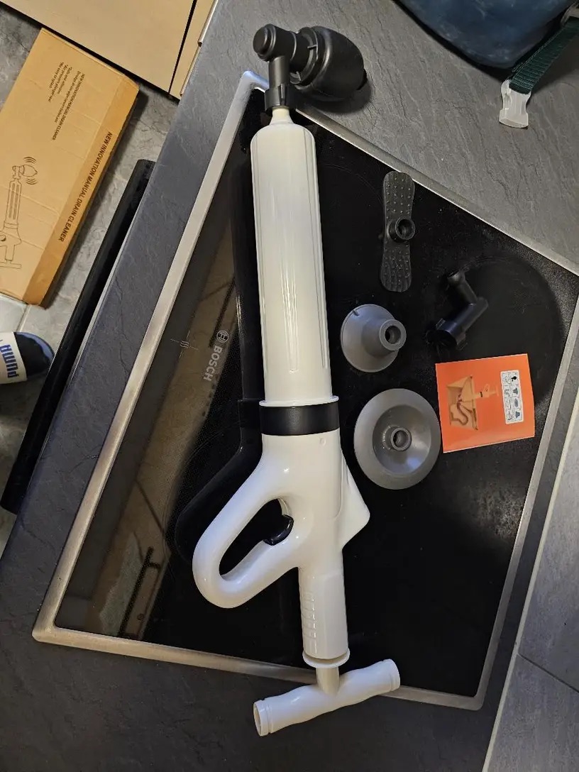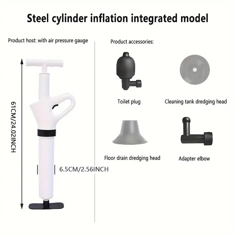 Blasts through stubborn blockages with high-pressure air — perfect for toilets, sinks, and drains!